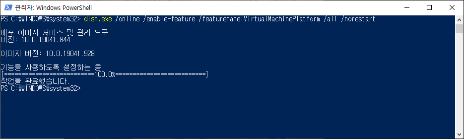 dism.exe /online /enable-feature /featurename:VirtualMachinePlatform /all /norestart