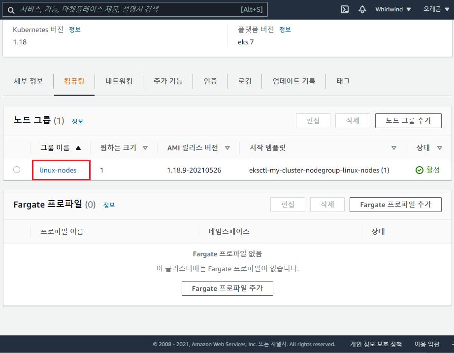 노드그룹 상세정보에서 인스턴스 유형, Auto Scling그룹, 노드의 크기, 서브넷 구성 등을 확인할 수 있습니다.