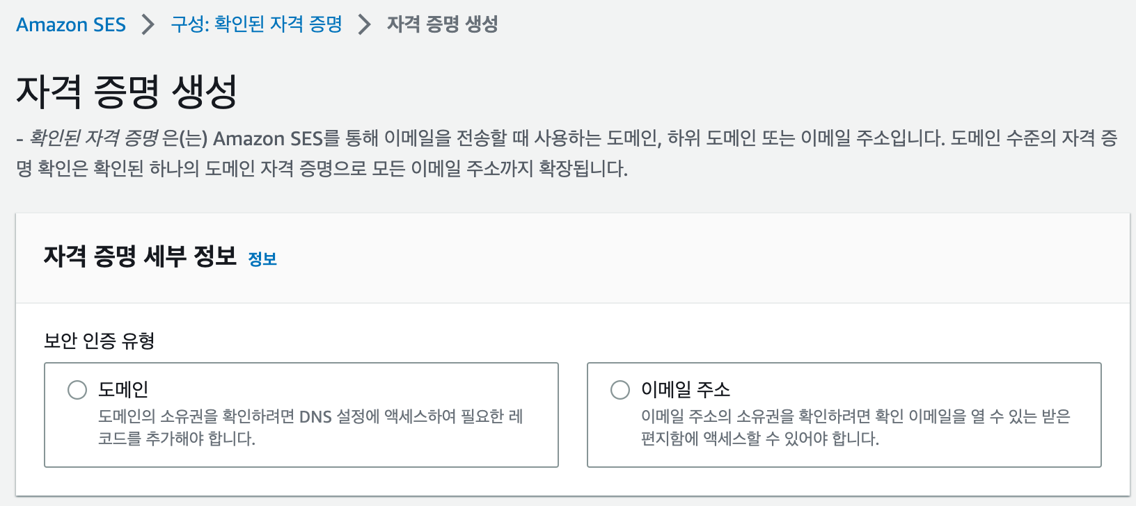 - 도메인 : 확인된 도메인의 모든 하위 도메인이나 이메일 주소에서 이메일을 보낼 수 있습니다.