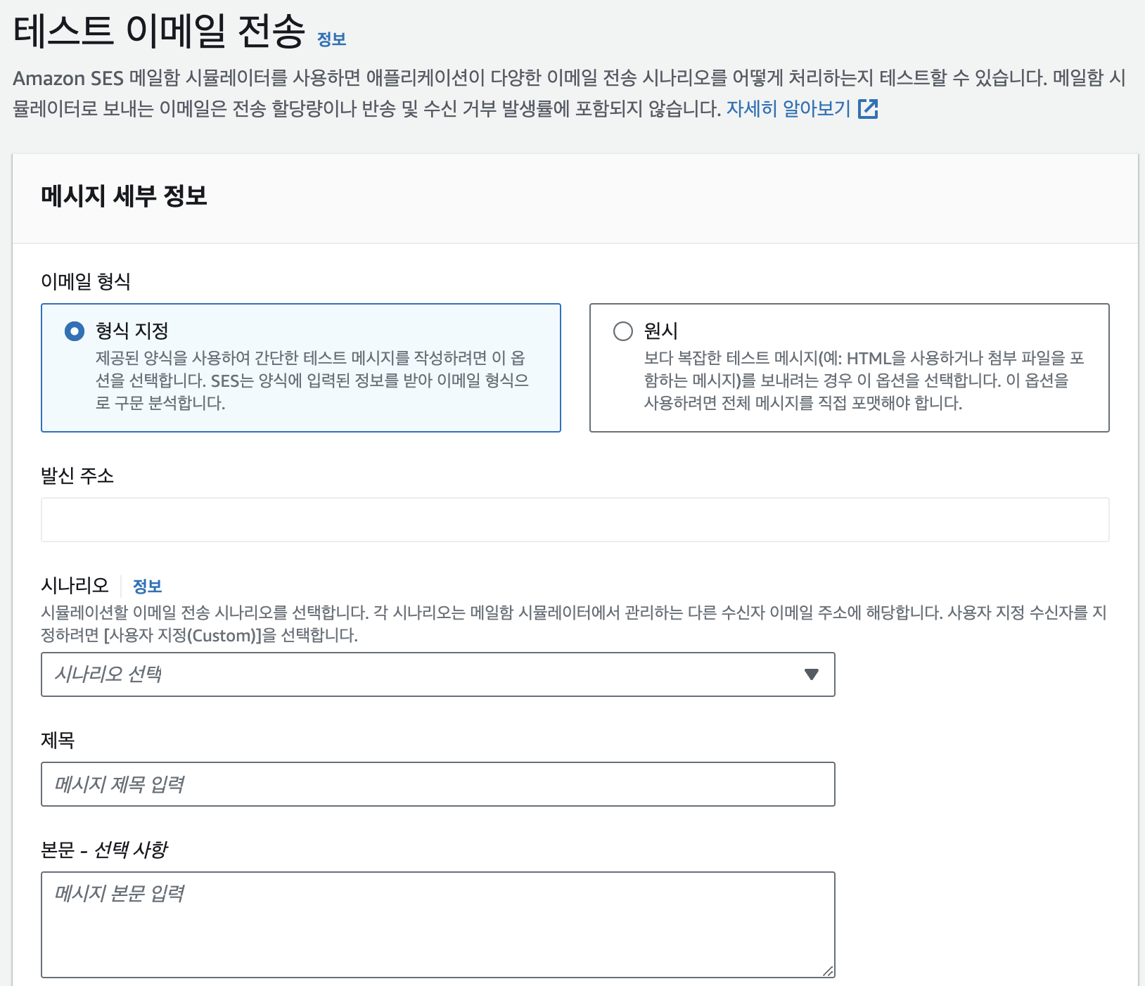 - 확인된 이메일 주소 및 도메인 또는 Amazon SES 메일박스 시뮬레이터로만 메일을 보낼 수 있습니다.